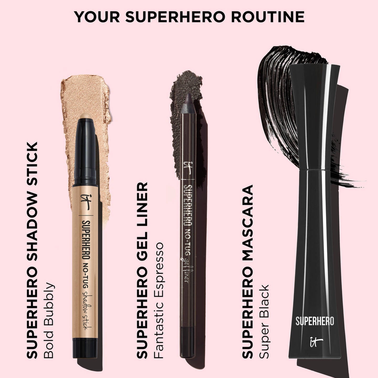 Swipe Superhero No-Tug Waterproof Eyeshadow Stick onto your eyelids for super smooth, super blendable, super all-day wear results. Use your fingertips to blend effortlessly. Complete your super eye transformation with Superhero No-Tug Sharpenable Gel Eyeliner and Superhero Elastic Stretch Volumizing and Lengthening Mascara!
